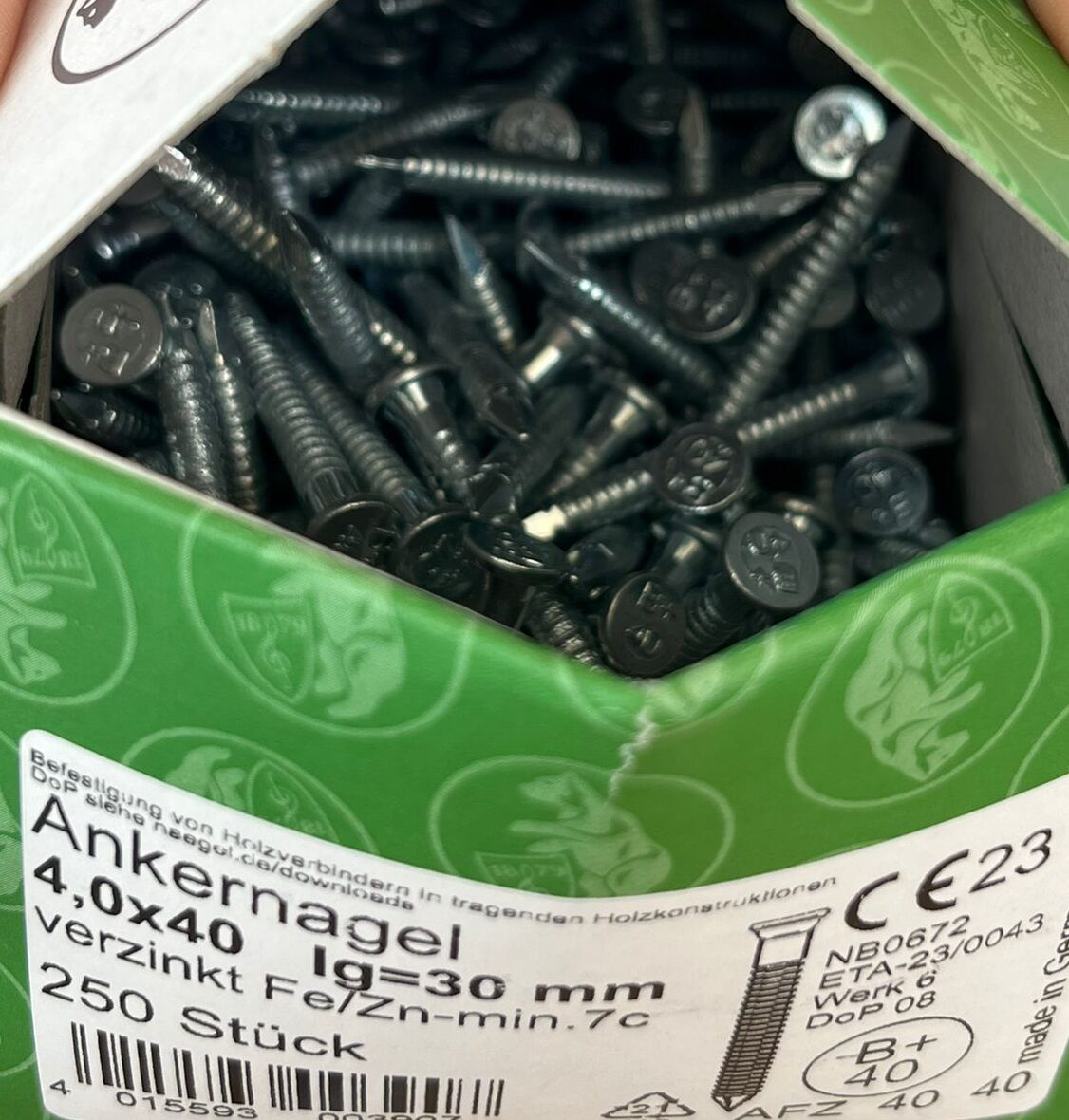 Enkurnagla 4×40 mm ir speciāla būvniecības nagla, kas paredzēta metāla būvkalumu (piemēram, stūra leņķu, plākšņu) stiprināšanai pie koka konstrukcijām.
